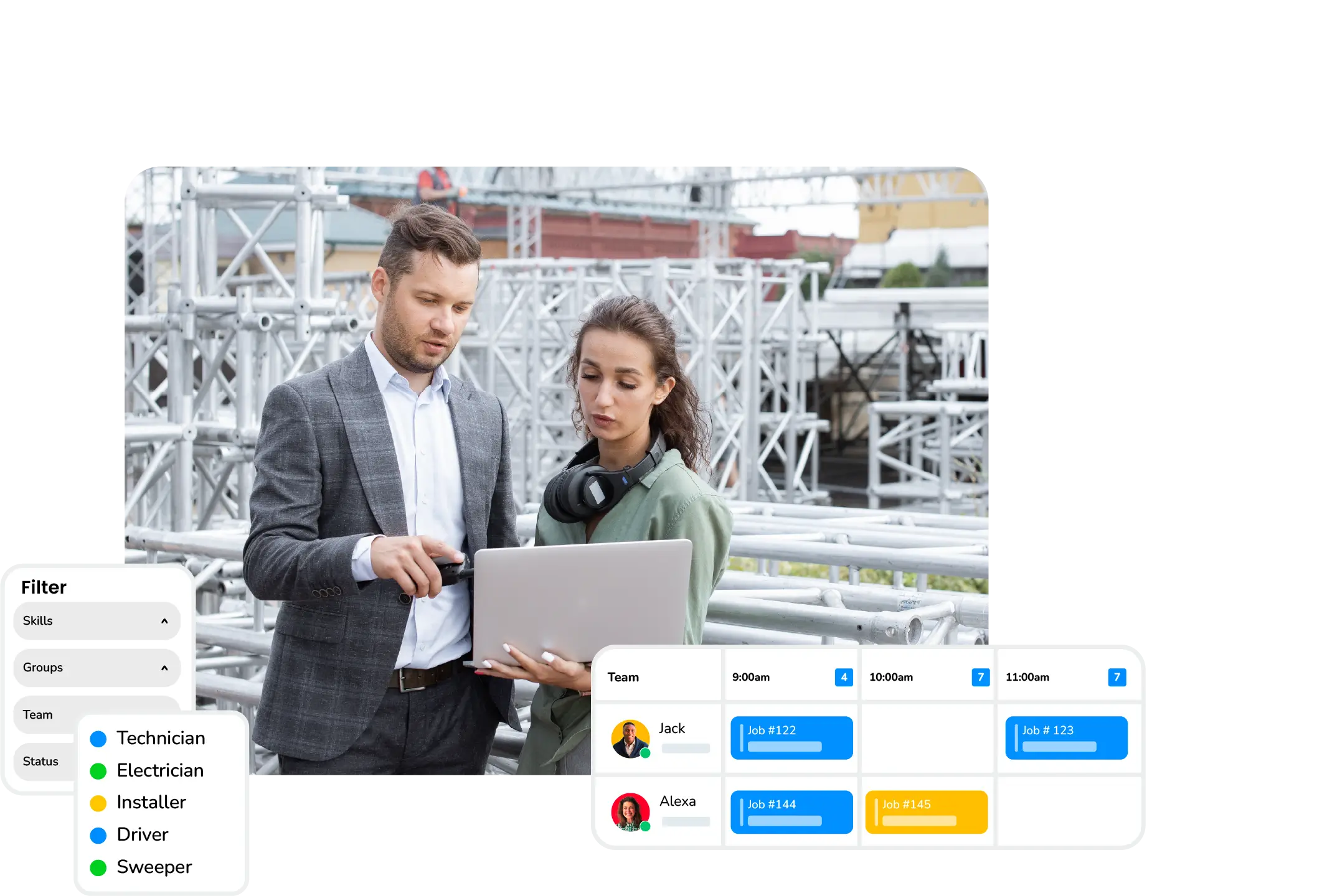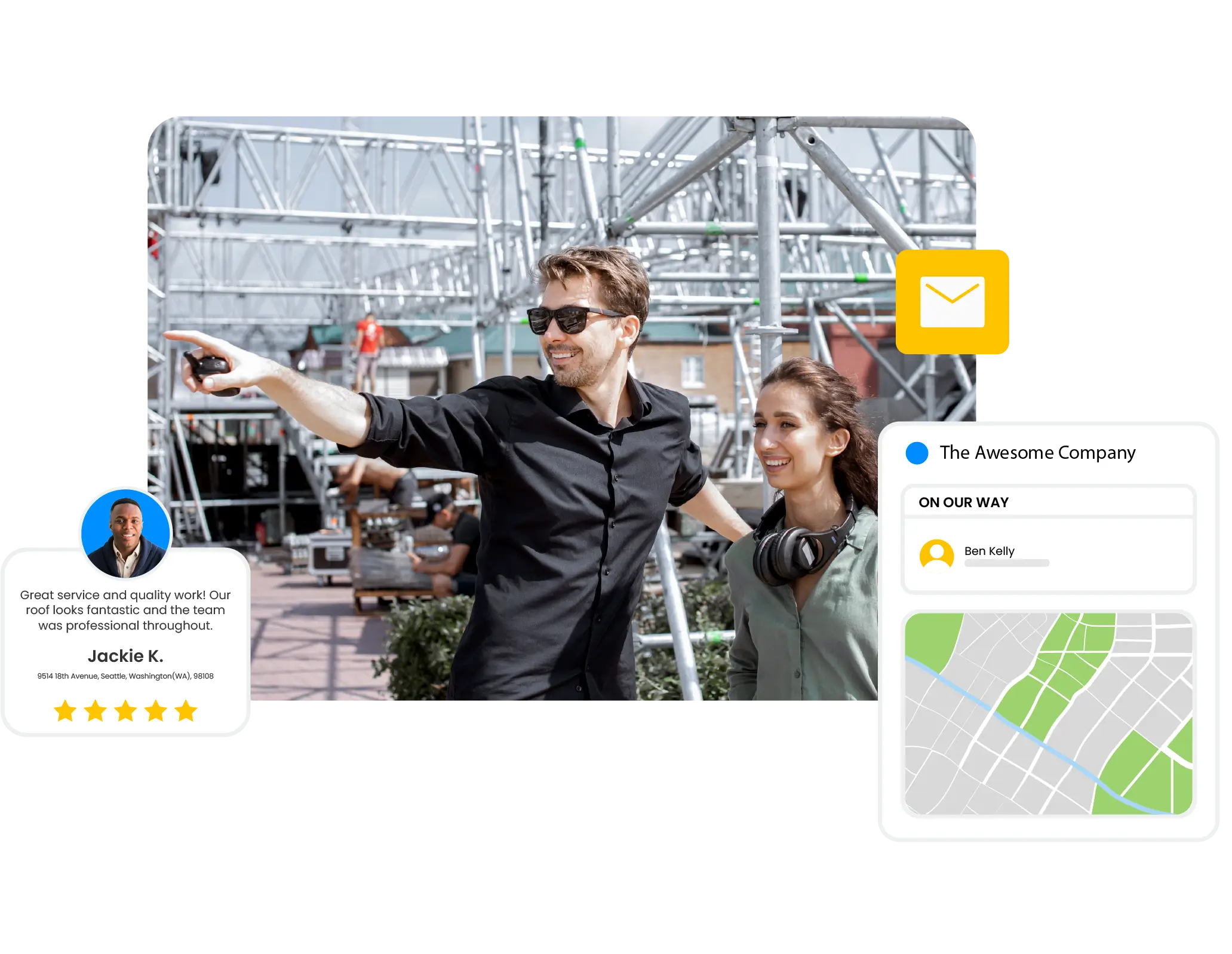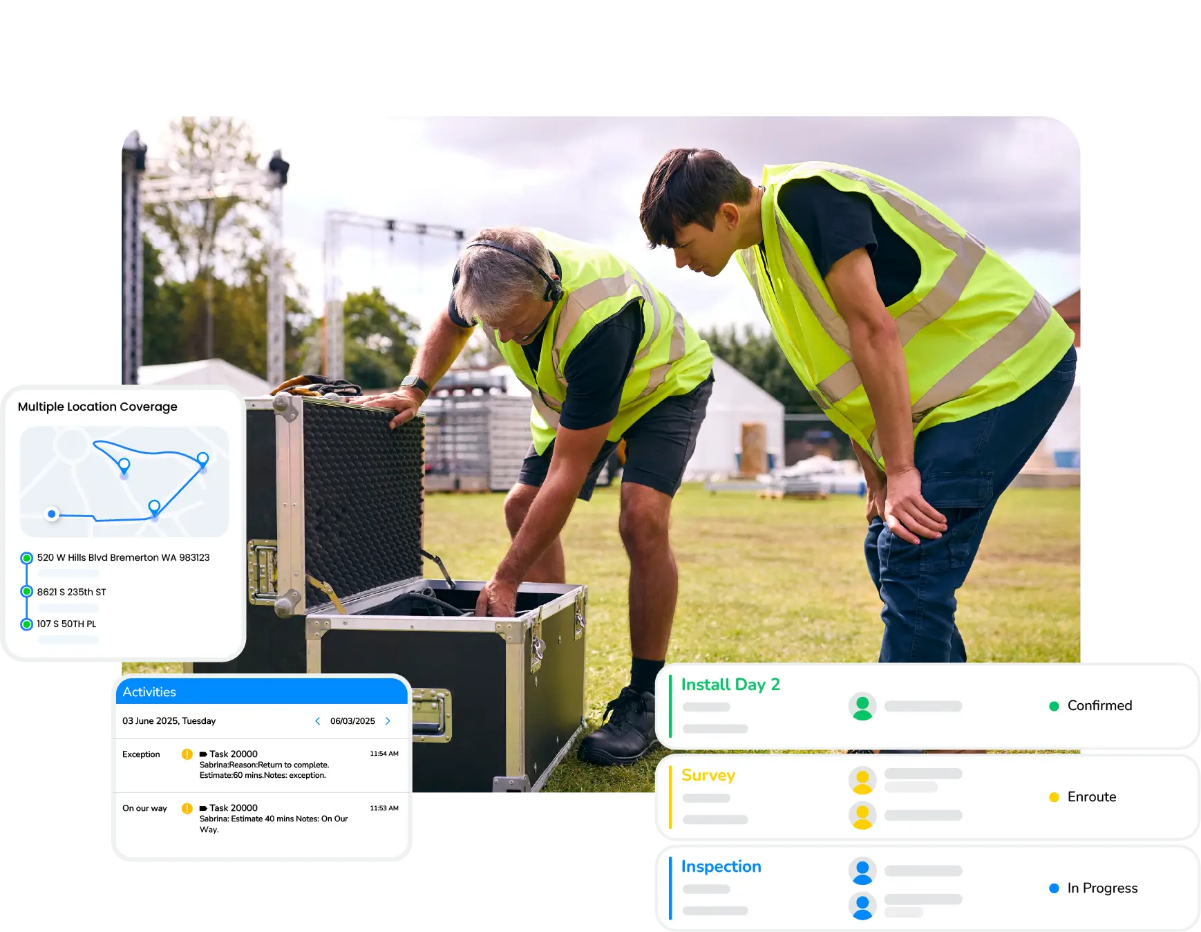 - Keep clients informed in real time with automatic updates on crew arrival, setup progress, and task completion